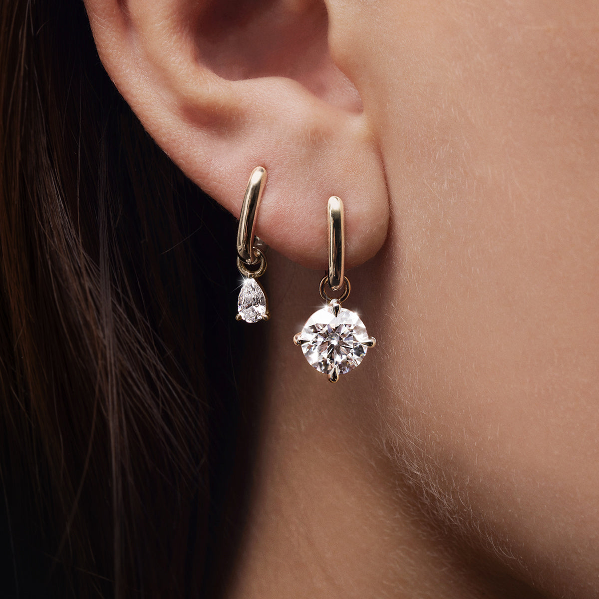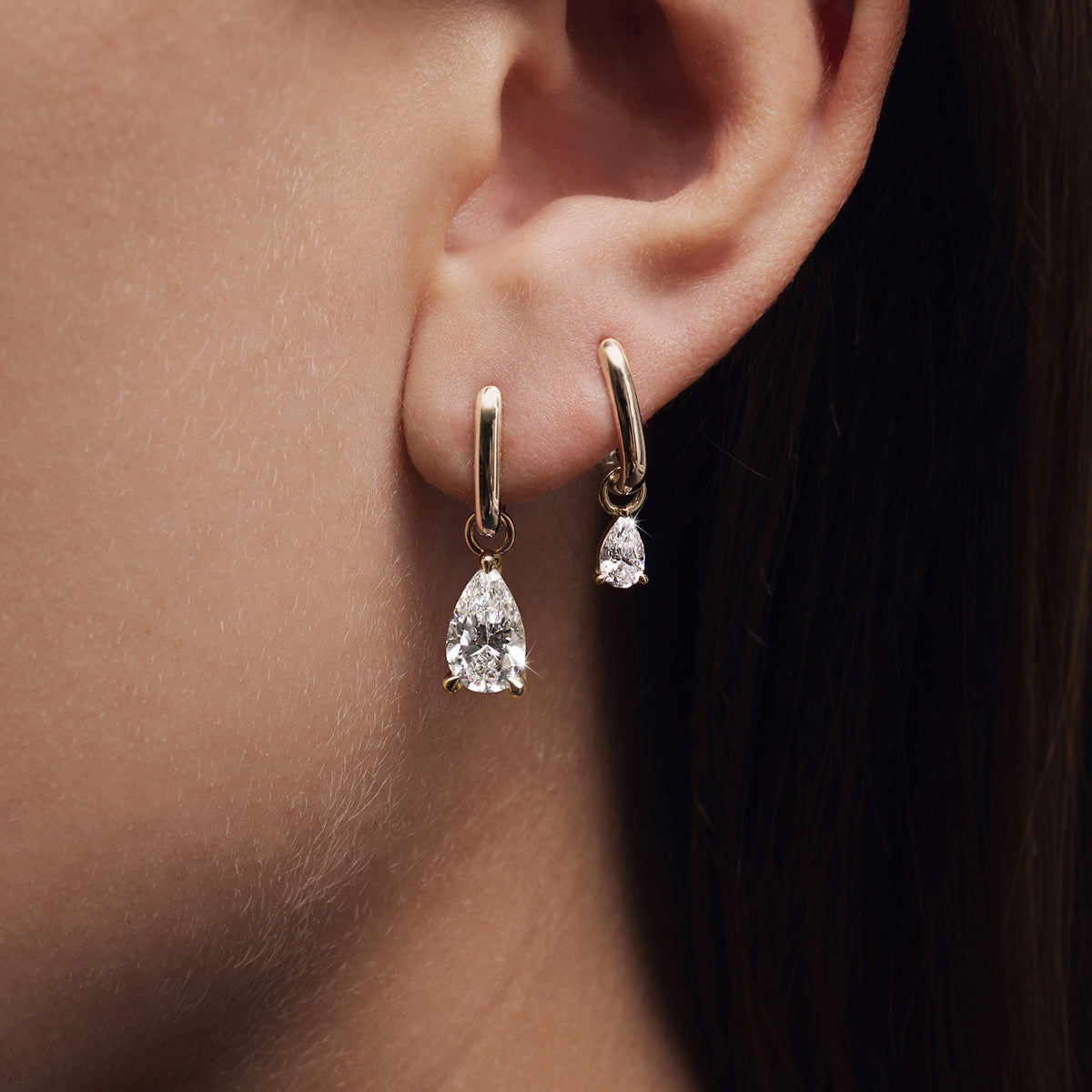 The LOEV Allday 14kt polished gold huggies are a contemporary oval shape and each feature a removable sparkling 0.50ct or 1.00ct pear cut lab grown diamond drop. Allowing you to customize your style by choosing to wear them with the diamond drop or as plain gold huggies.