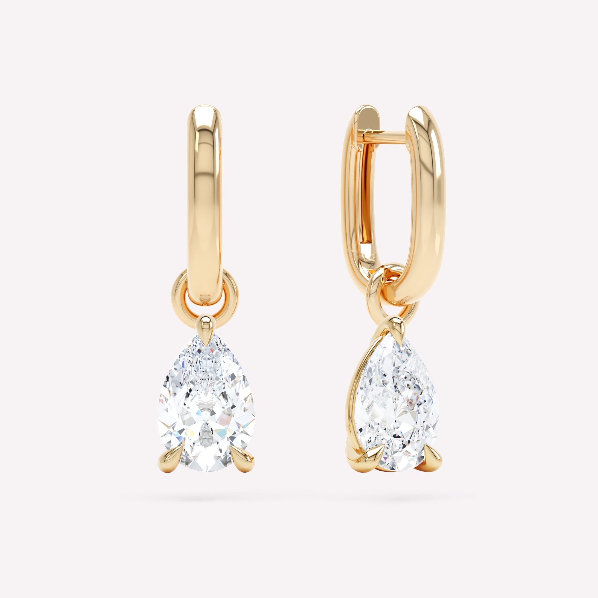 • 0.50 or 1.00 ct Pear cut D/E color lab grown diamonds of very slightly included or better clarity (VS+) in each hoop
