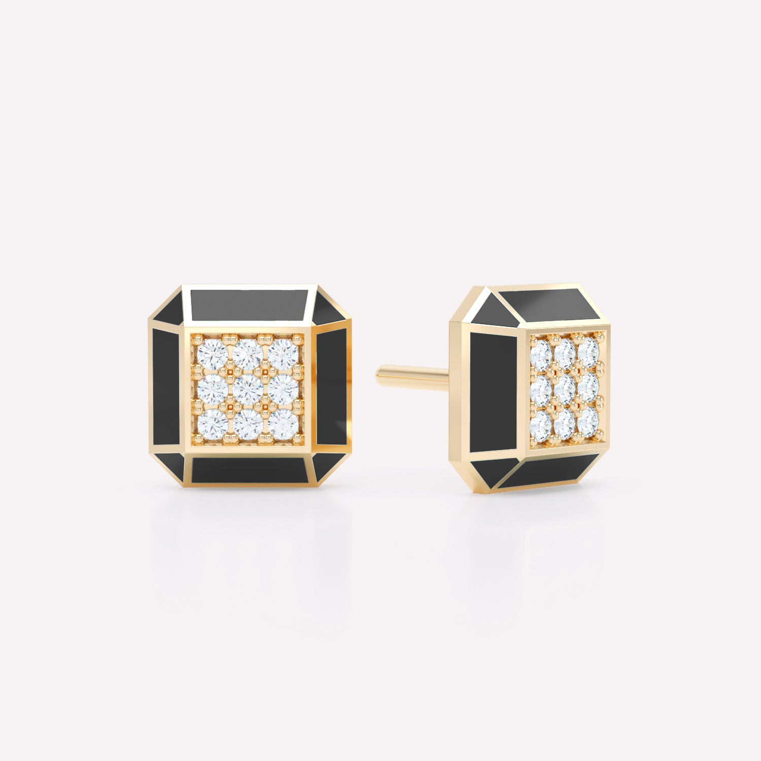 Clean geometric lines and enamel contrast. The Eternity black enamel diamond studs are handcrafted with 0.20ct of lab grown diamonds and 18Kt recycled white gold. Available as a pair or single earring, allowing you to mix and match with the Eternity huggie hoops or Ear Cuffs.