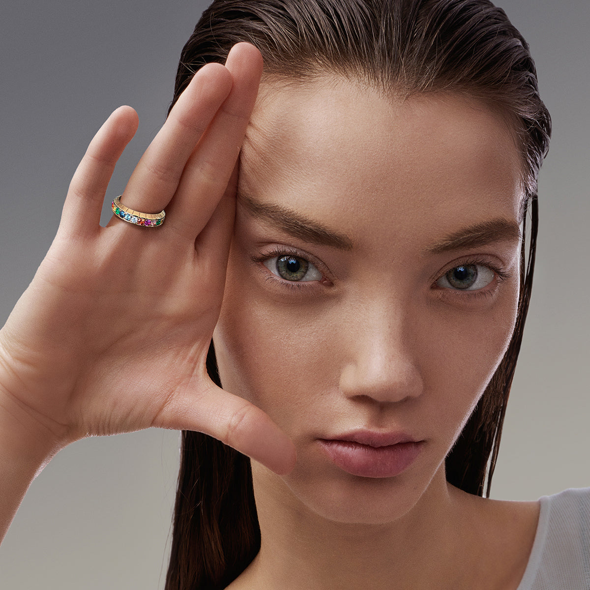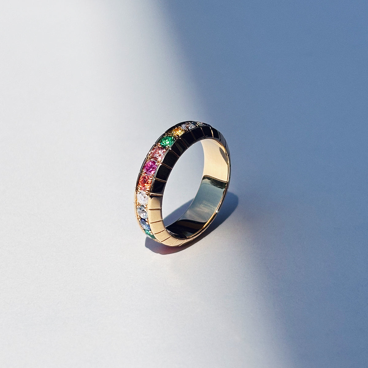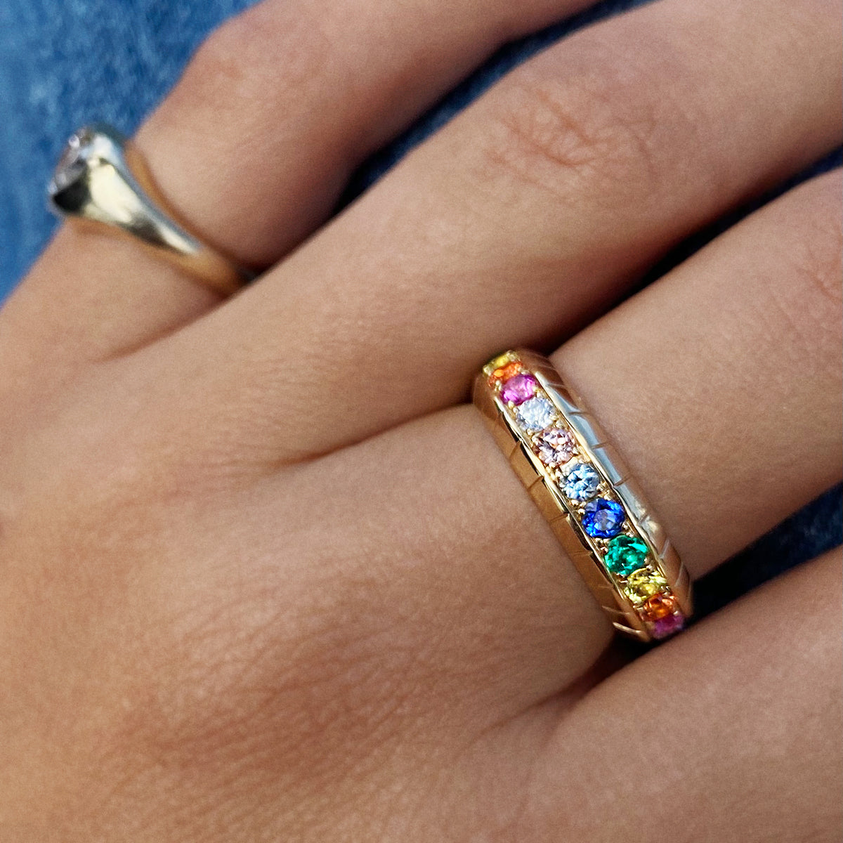 The LOEV Eternity ring is set with a rainbow of brilliant cut lab grown sapphires, emeralds and diamonds. Handcrafted with LOEV`s signature engraved gold in 18Kt recycled gold.