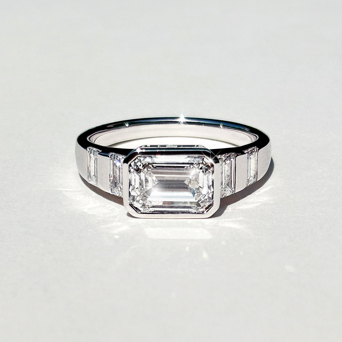 The LOEV Diamond Striped Ring is handcrafted with a step cut Emerald set East West and flanked uniquely by striped diamond Baguette cut diamonds.