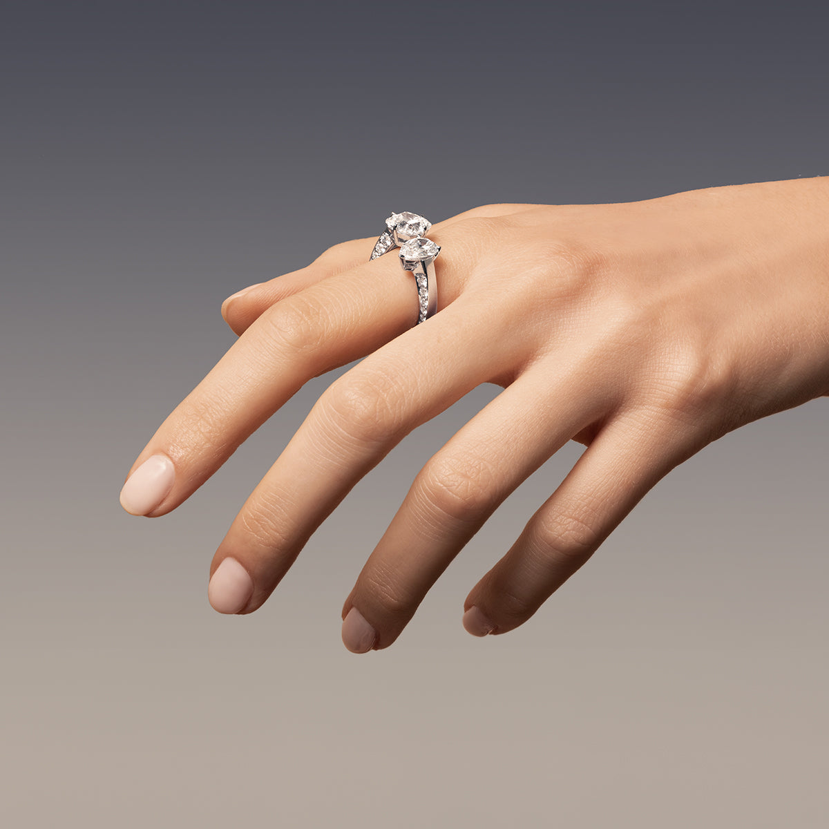 Two diamonds, one story – our sculptural Floating Diamond Ring is a luminous duet of (1.5ct) pear and (2.2ct) cushion cut lab-grown diamonds, suspended in a timeless union. Curved diamond lines connect the two contrasting cuts, beautifully set in 18kt recycled gold.