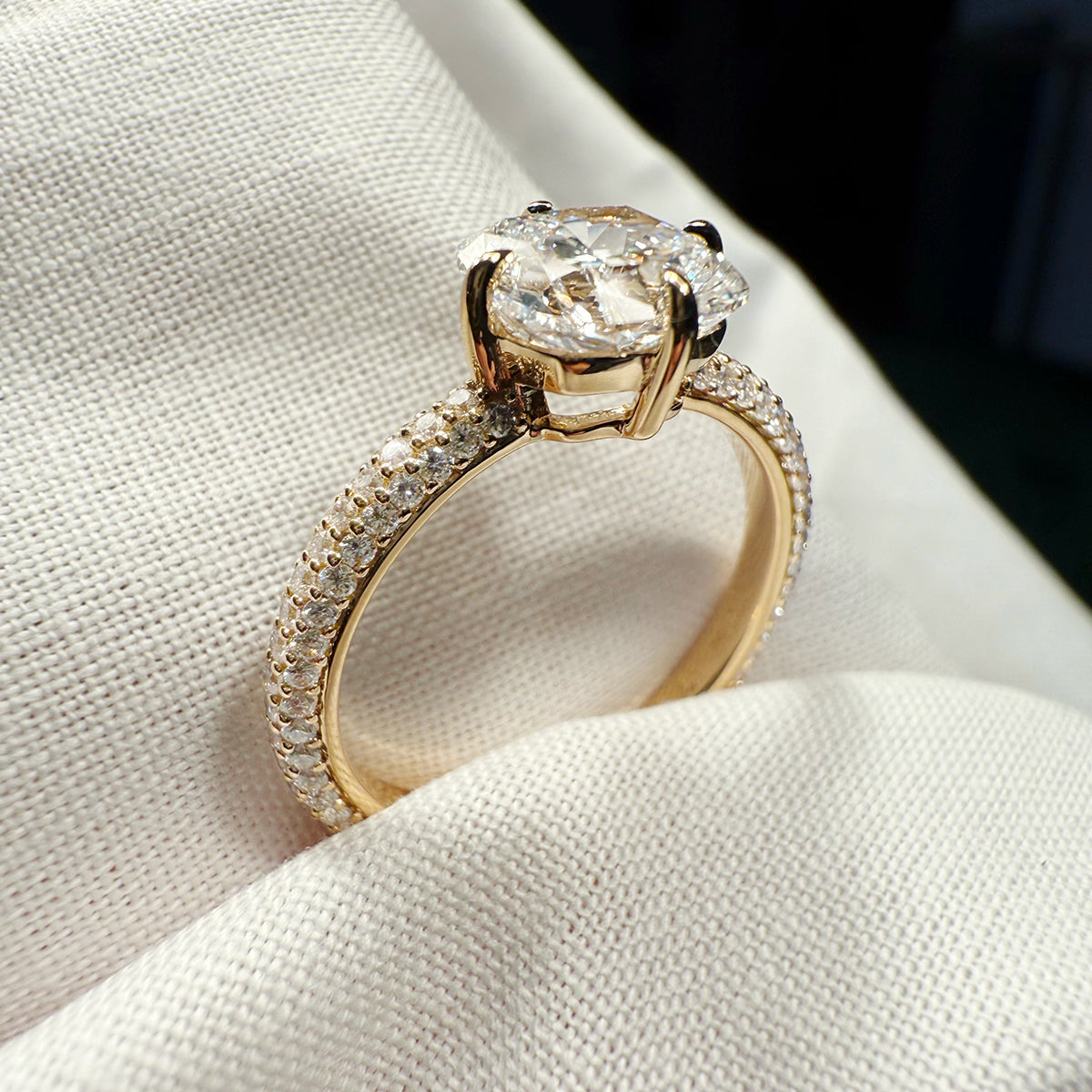 The LOEV Pavé Solitaire Ring is handcrafted with a Cushion cut diamond and set on a band of brilliant Pavé diamonds in 18kt recycled gold. The contemporary prongs hug the centre 1.5 carat Cushion which is E/F in color and of VVS2/VS1 clarity. The 3 D pavé band is set 3/4 around the band creating the perfect ring to pop the questions with.
