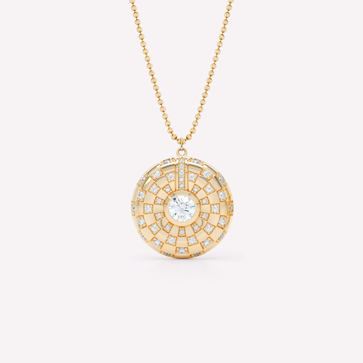 The LOEV Toi et Moi medallion features a modern checkerboard pattern created with Brilliant cut lab grown diamonds and handcrafted in 18Kt recycled gold. It comes with a 18Kt recycled gold chain.
