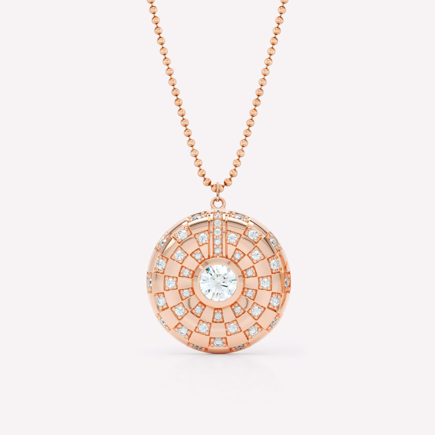 The LOEV Toi et Moi medallion features a modern checkerboard pattern created with Brilliant cut lab grown diamonds and handcrafted in 18Kt recycled gold. It comes with a 18Kt recycled gold chain.